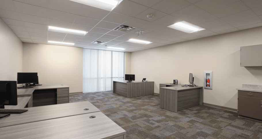 The building was partially occupied and consisted of selective demolition, cast-in-place concrete, masonry, structural steel framing, flashing and trim, millwork, HVAC and ductwork, plumbing, fixtures, electrical lighting and wiring, storefronts, doors, painting, millwork, upgraded break room and bathrooms.